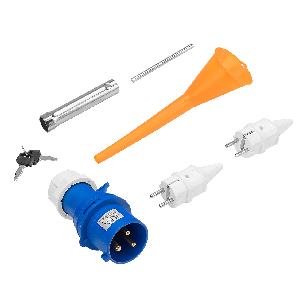 Генератор - 1 штКлюч свечной - 1 штКлюч зажигания - 2 штВилка 230В/16А - 2 штВилка 230В/32А - 1 штРуководство по эксплуатации с гарантийным талоном - 1 шт