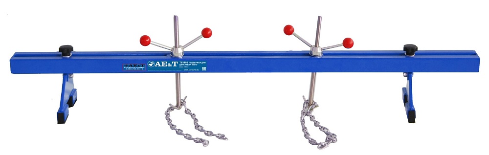 Одной из особенностей поддержки AE&T T63105 является возможность подвешивания двух автомобильных механизмов. Такое устройство выполнено из прочного и толстого металла. Его удерживающие узлы имеют ручные винтовые механизмы, которые дают возможность быстро изменять высоту поднятия груза. Регулировочные болты размещены по обе стороны балки. Они позволяют точно позиционировать груз по горизонтали. Металлические цепи каждого из узлов надежно и прочно фиксирует подвешенный механизм.