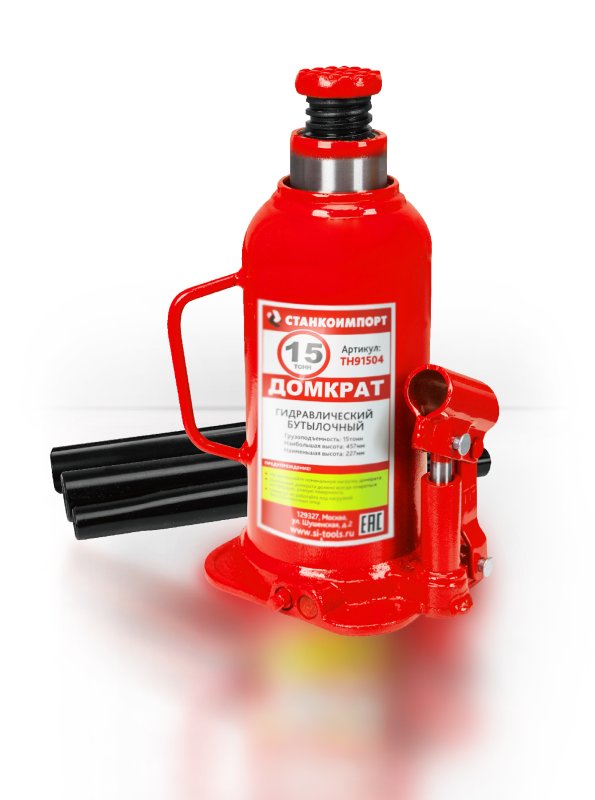 Домкрат бутылочный грузоподъемностью до 15 тонн используется при ремонте и техническом обслуживании транспортных средств, для поднятия тяжестей при строительстве или ремонтных работах.