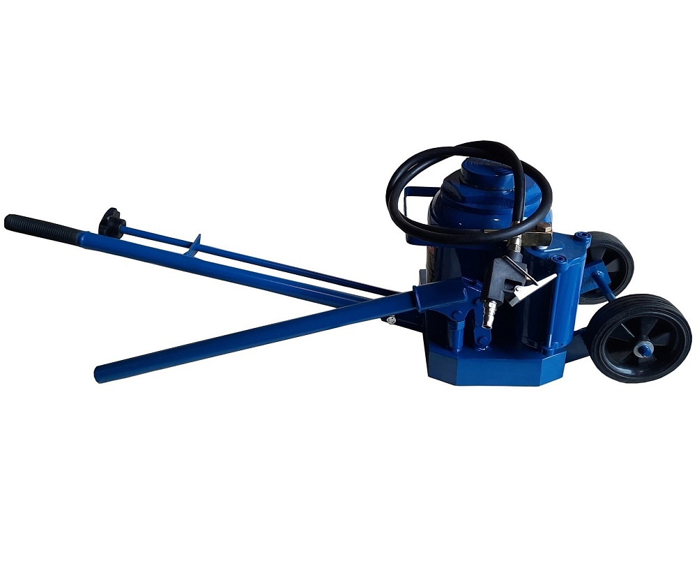 Подхват под раму и мосты грузовых автомобилей и спецтехники. Увеличенный диаметр металлических колес домкрата, позволяет легко транспортировать его по не ровным поверхностям.  Можно поднимать автомобили для ремонта ВМЕСТЕ С ГРУЗОМ.  Пневмогидравлический. г/п 50т. Высота подъема 280-470мм. Ход поршня 190 мм.