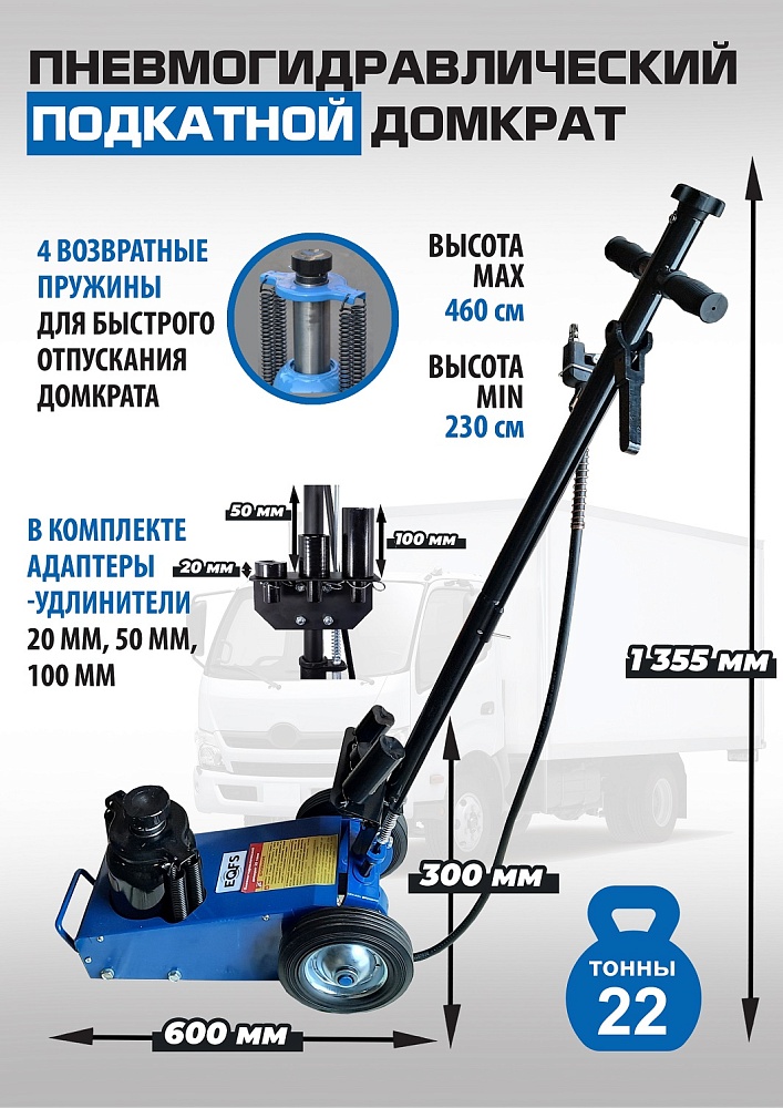 Пневмогидравлический подкатной домкрат имеет повышенную грузоподъемность и выполнен из качественных узлов и деталей. Домкрат обеспечивает минимальную высоту подхвата и значительную высоту подъема. Хромированный и закаленный шток цилиндра обеспечивает надежность работы. Встроенный клапан безопасности надежно защищает оборудование от перегрузок. Домкрат рекомендуется к применению в шиномонтажных мастерских, автосервисах и авторемонтных предприятиях. Минимальная высота подхвата: 230 мм. Максимальная высота подъема с удлинителем: 460 мм. Г/П - 22 тонны. Цвет темно-синий.