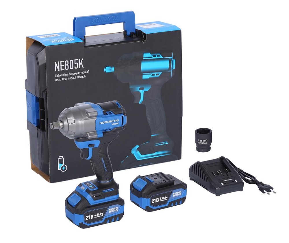 Гайковерт аккумуляторный, 1/2", 21 В, 1000 Нм, 2 аккумулятора 4 A и зарядное устройство, в кейсе NORDBERG NE805K
