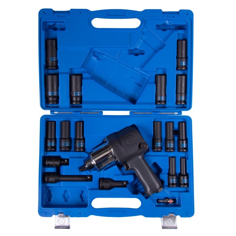 Гайковерт профессиональный пневматический ударный 1/2", максимальный крутящий момент 1500 Нм., скорость вращения 8000 об/мин., расход воздуха 200 л/мин. В комплекте 8 ударных головок и удлинитель.