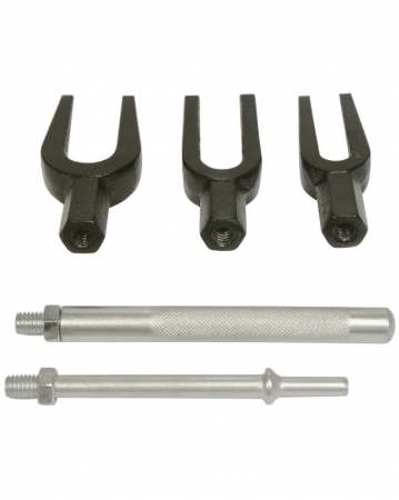 Универсальный комплект для демонтажа шаровых опор и рулевых тяг легковых автомобилей, а также легкого коммерческого транспорта. Комплектация “Вилка” зев 18 мм – 1шт. “Вилка” зев 24 мм – 1шт. “Вилка” зев 28 мм – 1шт. Рукоятка держатель – 1 шт. Адаптер для пневмолотка – 1 шт.