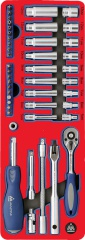 • Головки торцевые шеститигранные короткие 1/4". Размеры: 5, 6, 7, 8, 9, 10, 11, 12, 13 мм.• Головки торцевые шеститигранные глубокие 1/4". Размеры: 5, 6, 7, 8, 9, 10, 11, 12, 13 мм.• Вороток реверсивный (трещотка) с флажком, 45 зубцов и кнопка быстрого сброса 1/4" 125 мм.• Вороток срывной с шарниром на 180 градусов 1/4" 130 мм.• Вороток с торцевой рукояткой 1/4" 150 мм.• Удлинитель прямой 1/4" 75 мм.• Удлинитель гибкий 1/4" 150 мм.• Кардан шарнирный 1/4".• Переходник адаптер для вставок 1/4".Вставки:• Вставки 1/4" TORX с отверстием. Размеры: Т10, Т15, Т20, Т25, Т27, Т30, Т40.• Вставки 1/4" шестигранники. Размеры: 3, 4, 5, 6 мм.• Вставки 1/4" шлицевые. Размеры: 4, 5, 6 мм.• Вставки 1/4" Phillips. Размеры: РН1, РН2, РН3.• Вставки 1/4" Pozidrive. Размеры: PZ1, PZ2, PZ3.