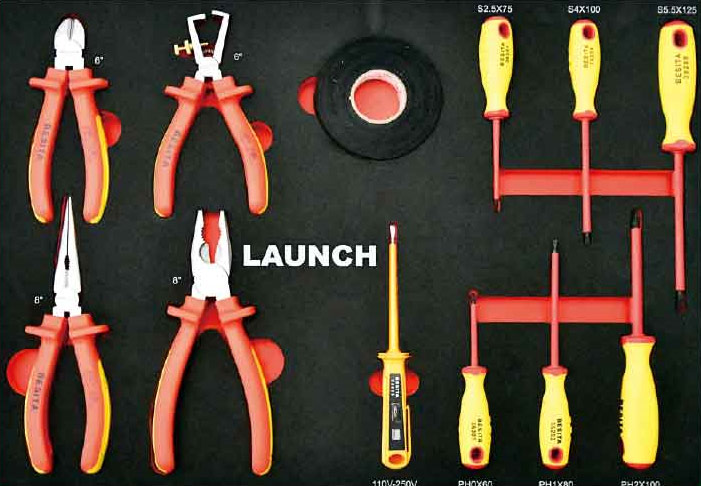Ложемент 5 Набор электро-изолированных отверток: PH0 Х 60мм, PH1 Х 80мм, PH2 Х 100мм, S2,5 Х 75мм, S4 Х 100мм, S5,5 Х 125мм индикатор напряжения 110-250V электро-изолированные пассатижи 8', утконосы 8' , кусачки 6', приспособление для зачистки кабелей 6' изолента