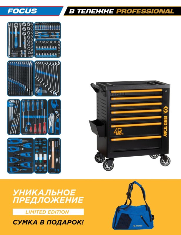 Набор инструментов 188 предметов, "FOCUS", в черной тележке KING TONY 9G38-188MRV40 купить в Красноярске цена ✅ - Все для СТО