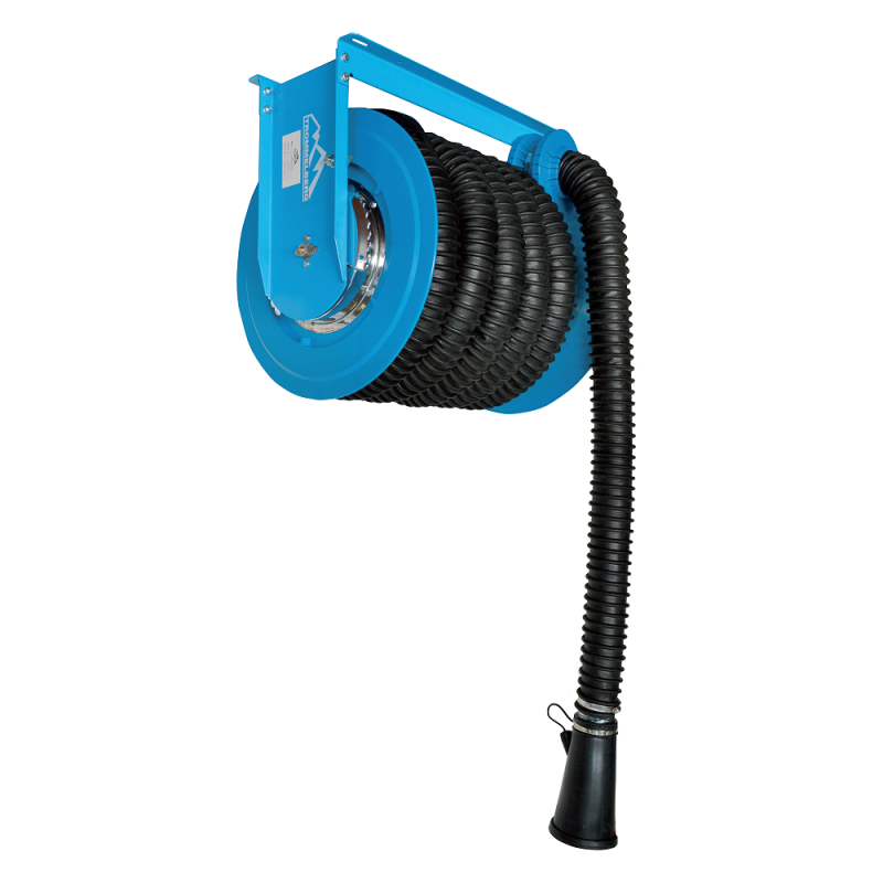 Металлическая катушка с шлангом и насадкой для удаления выхлопных газов любых легковых автомобилей. Для полноценной работы необходимо подключение вентилятора соответствующей производительности. Мощность вентилятора необходимо выбирать в зависимости от длины газоотводного короба и количества катушек.