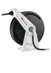 Катушка из алюминия и композитных материалов с одной опорой для консистентной смазки под высоким давлением Основные характеристики • Алюминиевое основание и опора обеспечивают прочность для работы в самых тяжелых условиях и в то же время небольшой вес, позволяющий легко снять катушку • Алюминиевое основание и опора с покрытием на основе порошковой эпоксидной смолы, бобина из композитного материала и крепежи из нержавеющей стали обеспечивают защиту от коррозии в условиях повышенной влажности • Никелированный вал и шарнир противостоят износу и коррозии и обеспечивают совместимость с широким рядом жидкостей . • Бобина монтирована на два не требующих регулярной смазки шарикоподшипника упрощает разматывание шланга и улучшает характеристики пружины . •Большая эффективная радиальная площадь запирания . • Устройство выпуска шланга с шестью роликами повышает долговечность шланга, предотвращает зажим шланга и снижает трение