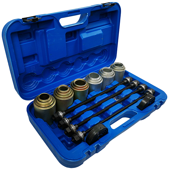 Набор для монтажа и демонтажа подшипников и сайлентблоков универсальный позволяет производить замену подшипников, сайлентблоков и втулок. Перед применением требуется подобрать оправку необходимого размера, установить на запрессовываемую / выпрессовываемую деталь и, вращая гайку, произвести монтаж / демонтаж. Использование набора позволяет избежать повреждения новой детали при установке и упрощает процесс монтажа.