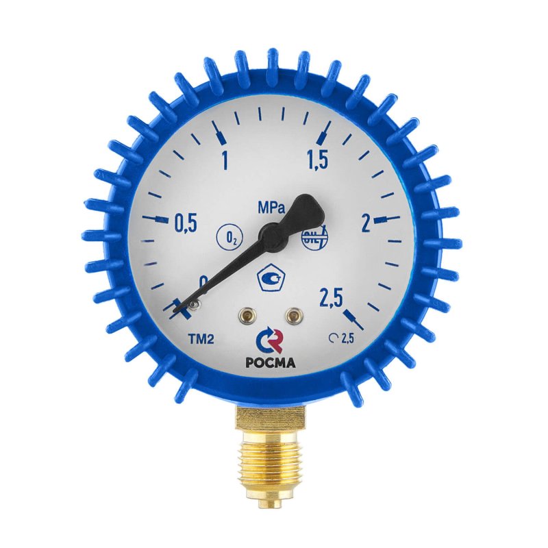 Диаметр корпуса манометра 63 мм. Корпус дополнительно защищен резиновым кожухом для сохранности манометра от механических повреждений.