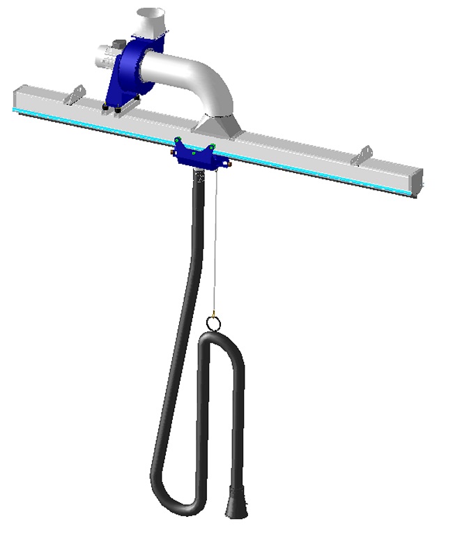 В комплектацию системы входит: профильный алюминиевый рельс, скользящие каретки, термостойкий шланг, подвес для шланга, вытяжные насадки, вытяжной вентилятор, кронштейны для крепления рельса, аксессуары для крепления и подключения вентилятора.