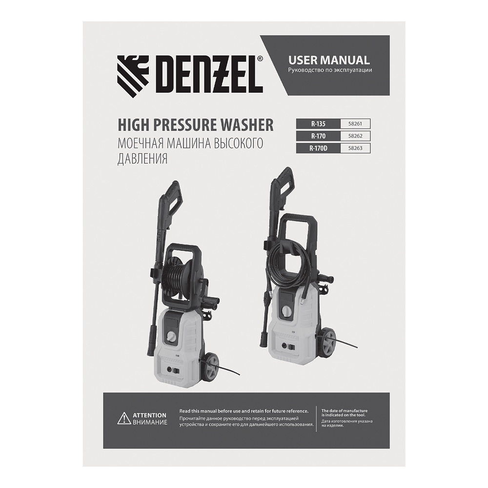 <p>Моечная машина высокого давления Denzel R-170 58262 мощностью 1800 Вт поддерживает максимальное рабочее давление до 170 бар и обеспечивает объем подачи воды 380 л/ч. Позволяет быстро и эффективно очистить садовый инвентарь, фасад дома, дорожку, отмыть автомобиль и т.д. Оснащена самовсасывающим помпой, поэтому может работать даже без подключения к водопроводу — подойдет любой резервуар или емкость с водой. Машина оптимальна для бытового использования.</p><h2>Преимущества</h2><ul><li>Долговечность — надежная алюминиевая помпа со стальными плунжерами выдерживает высокие нагрузки и обеспечивает стабильное давление в течение всего срока службы машины.</li><li>Эффективное очищение — для получения качественного результата можно использовать моющее средство (внешний пеногенератор с функцией улучшенного пенообразования входит в комплект поставки).</li><li>Простая подготовка к работе — быстросъемный адаптер облегчает подключение шланга подачи воды.</li><li>Защита от засорения — фильтр входного штуцера задерживает посторонние частицы, продлевая срок службы помпы.</li><li>Продуманная комплектация — машина поставляется с иглой для прочистки сопла, что упрощает уход за техникой.</li><li>Класс защиты II — токопроводящие элементы надежно изолированы для защиты пользователя от получения электротравмы.</li><li>Безопасность — перед началом работы необходимо разблокировать рычаг моечного пистолета для предотвращения случайного запуска.</li><li>Защита от превышения максимально допустимого давления — машина оснащена перепускным клапаном, манометрический выключатель останавливает насос при отпущенном рычаге пистолета.</li><li>Термозащита — производитель предусмотрел датчик температуры и автоматическое отключение двигателя при перегреве.</li><li>Комфортная работа — конструкцией предусмотрена эргономичная рукоятка с защитой от случайного пуска</li></ul><p> длина кабеля и шланга высокого давления составляет 5 м, что позволяет свободно передвигаться по участку.</p><p>Мобильность — благодаря транспортировочной рукоятке и колесам моечную машину удобно перемещать.|Гарантия 3 года — высокое качество техники подтверждено производителем.</p>