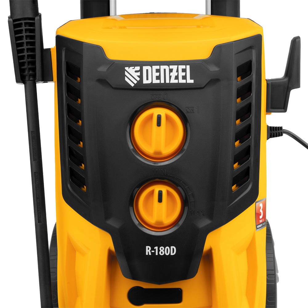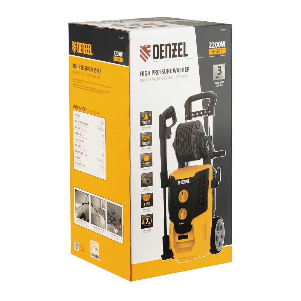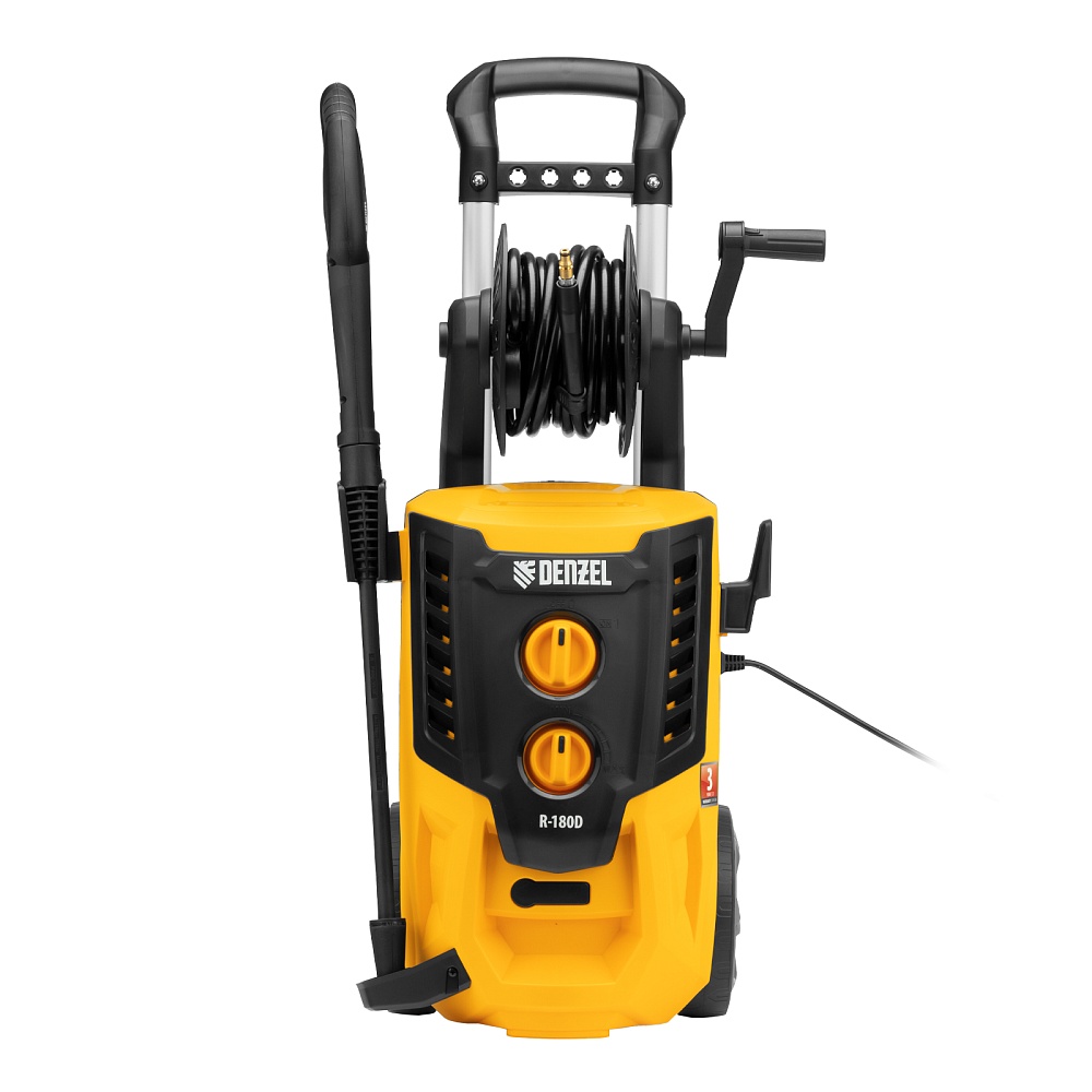<p>Моечная машина высокого давления Denzel R-180D 58239 с  барабаном, мощностью 2200 Вт и производительностью 380 л/ч подает струю воды под давлением 180 бар и используется для очищения поверхностей. Позволяет быстро привести в порядок садовые дорожки, удалить пыль и грязь с фасада здания, автомобиля, велосипеда или мотоцикла, отмыть садовый инвентарь. Моечная машина подключается к водопроводу, а при его отсутствии может забирать воду из любого резервуара, работая в режиме самовсасывания. Устройство пригодится для поддержания порядка на загородном участке.</p><h2>Преимущества</h2><ul><li>Надежность — двигатель с медной обмоткой выдерживает интенсивную эксплуатацию при высоких нагрузках.</li><li>Стабильная работа — алюминиевая помпа обеспечивает постоянное давление даже при длительном использовании.</li><li>Экологичность — мойка работает без вредных выхлопов, появление неприятных запахов исключено.</li><li>Термозащита — в случае перегрева двигатель автоматически отключается для предотвращения поломки.</li><li>Защита от случайного включения — конструкцией предусмотрена блокировка рычага пистолета.</li><li>Безопасность пользователя — токопроводящие элементы надежно изолированы, машине присвоен класс защиты II.</li><li>Чистая вода — встроенный фильтр задерживает посторонние примеси, продлевая срок службы мойки.</li><li>Использование моющего средства — машина имеет встроенный бачок, также можно подключить внешний пеногенератор, входящий в комплект поставки.</li><li>Регулировка количества пены встроенного пенокомплекта — можно подобрать оптимальный режим в зависимости от степени загрязнения поверхности.</li><li>Максимальная эффективность — моечная машина комплектуется грязевой фрезой, позволяющей быстро справиться даже с застарелыми загрязнениями.</li><li>Легкая подготовка к работе — благодаря быстросъемному адаптеру входной шланг подключается одним движением.</li><li>Увеличенная рабочая зона — шланг длиной 8 м и 7-метровый кабель позволяют свободно перемещаться по участку.</li><li>Простой уход — игла для прочистки сопла входит в комплект поставки.</li><li>Комфортная транспортировка — машина оснащена колесами и ручкой для удобного перемещения.</li><li>Функциональность — машина оборудована специальной катушкой для удобного вытягивания шланга на необходимую длину.</li><li>Удобное хранение — конструкцией предусмотрены держатель пистолета и кронштейн для сетевого кабеля.</li><li>Гарантия 3 года — высокое качество моечной машины подтверждено производителем.</li></ul>