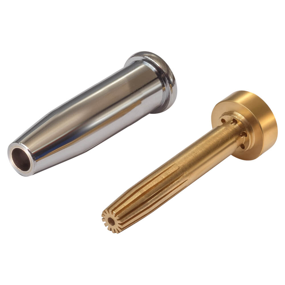 Медный наружный мундштук для ацетиленовых инжекторных резаков серии Р2А-02М. Маркировка мундштука №1А. Толщина разрезаемого металла зависит от установленного внутреннего мундштука. Совместим с внутренними мундштуками №1А, 2А, 3А и 4А.