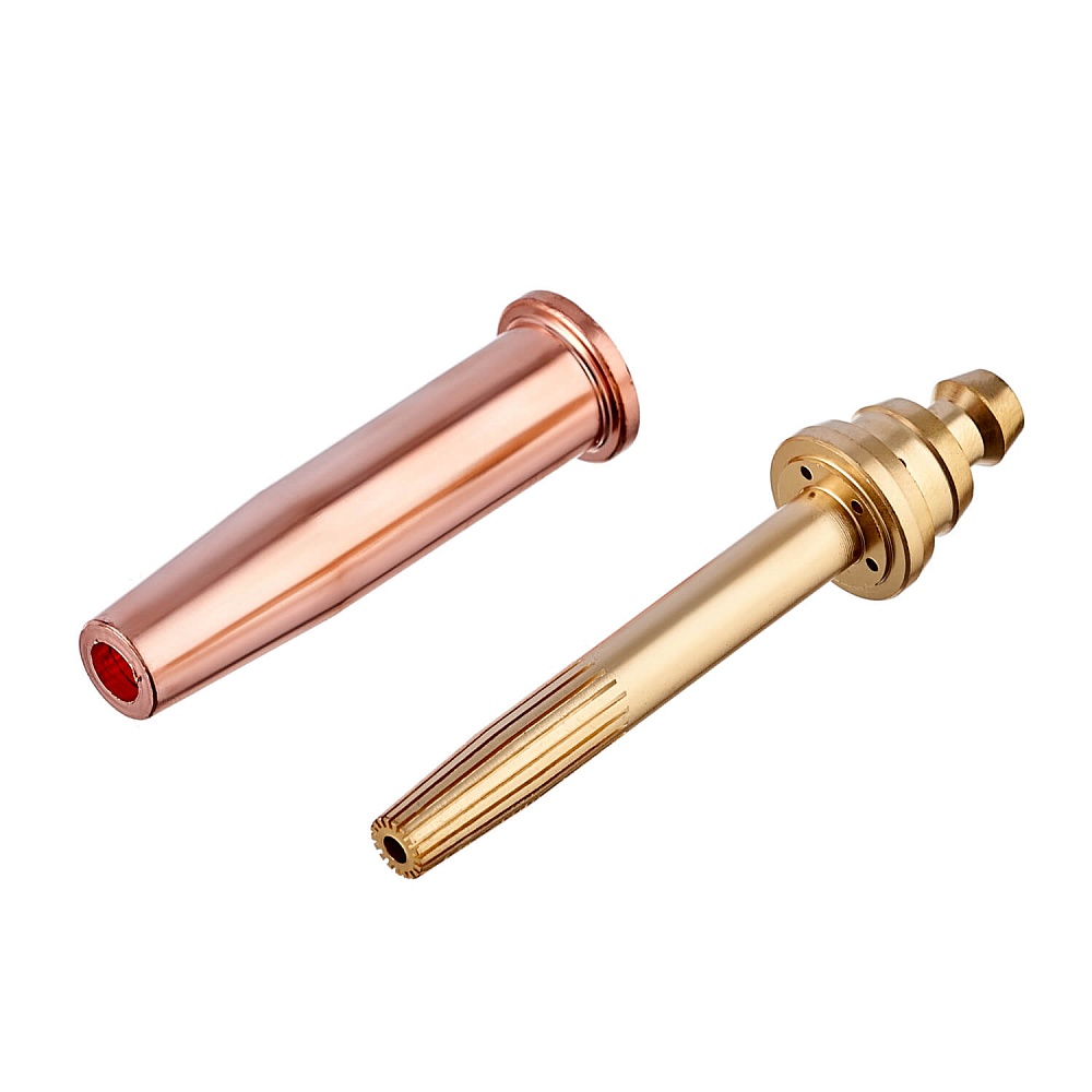 Медный наружный мундштук для ацетиленового инжекторного резака Р3А. Маркировка мундштука №2А. Толщина разрезаемого металла зависит от установленного внутреннего мундштука.