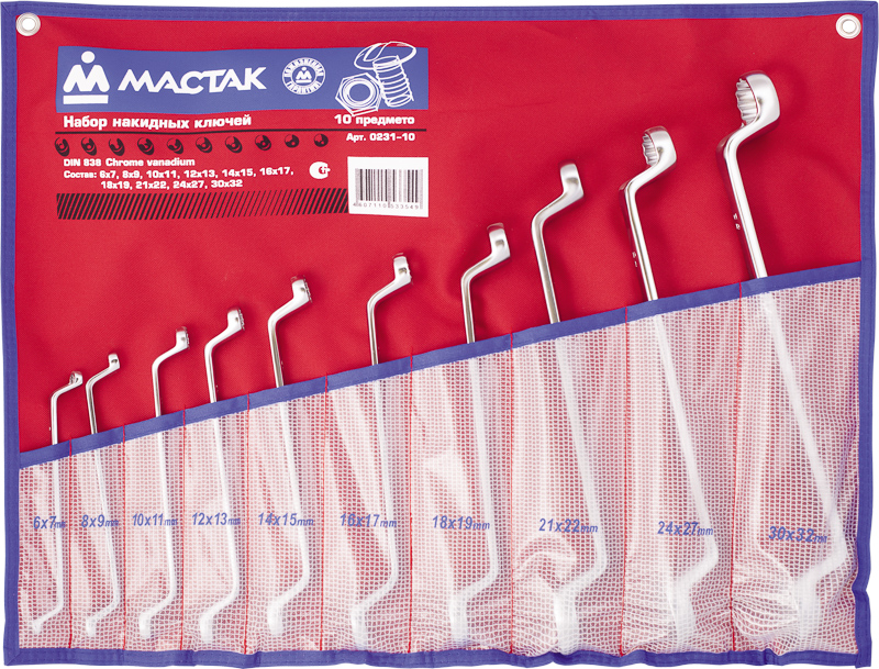 Набор накидных ключей  МАСТАК 0231-10P содержит 10 предметов. Предназначены для выполнения любых видов работ с крепежом - как дома, так и в авто-слесарных мастерских, станциях технического обслуживания, на производстве.