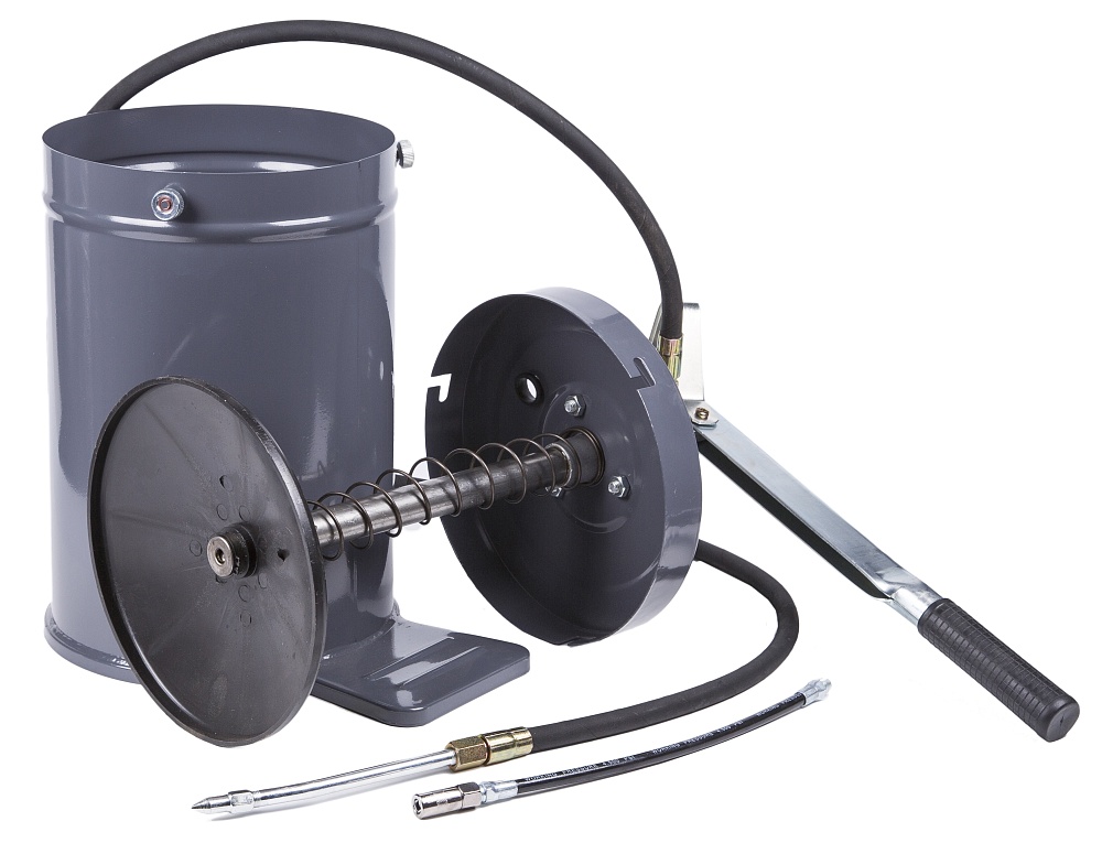 Нагнетатель солидола с ручным приводом KRW1797A представляет из себя стальную емкость объемом 10 литров с рычагом, воздействуя на который создается давление, необходимое для нагнетания густой смазки. Благодаря небольшим габаритам и рукоятке в верхней части обеспечивается мобильность и удобство использования нагнетателя в удаленных от станции техобслуживания местах. Для этого его заранее заправляют необходимым количеством смазки.