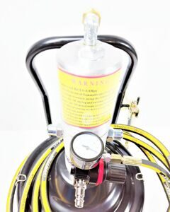 Нагнетатель смазки пневматический мобильный для шприцевания шарнирных соединений, подшипников и т.п. Производительность 800 г/мин. Объем бака – 13кг. Бак из нержавеющей стали. При давлении воздуха 6-8 атм давление смазки 350-400 атм максимально. В комплекте раздаточный пистолет с жестким наконечником, адаптер для подключения ¼”, шланг 4м. Рекомендуемое применение – слесарные мастерские, автотранспортные предприятия, производственные и сборочные предприятия. Бак для смазки изготовлен из нержавеющей стали для предотвращения коррозии корпуса нагнетателя.