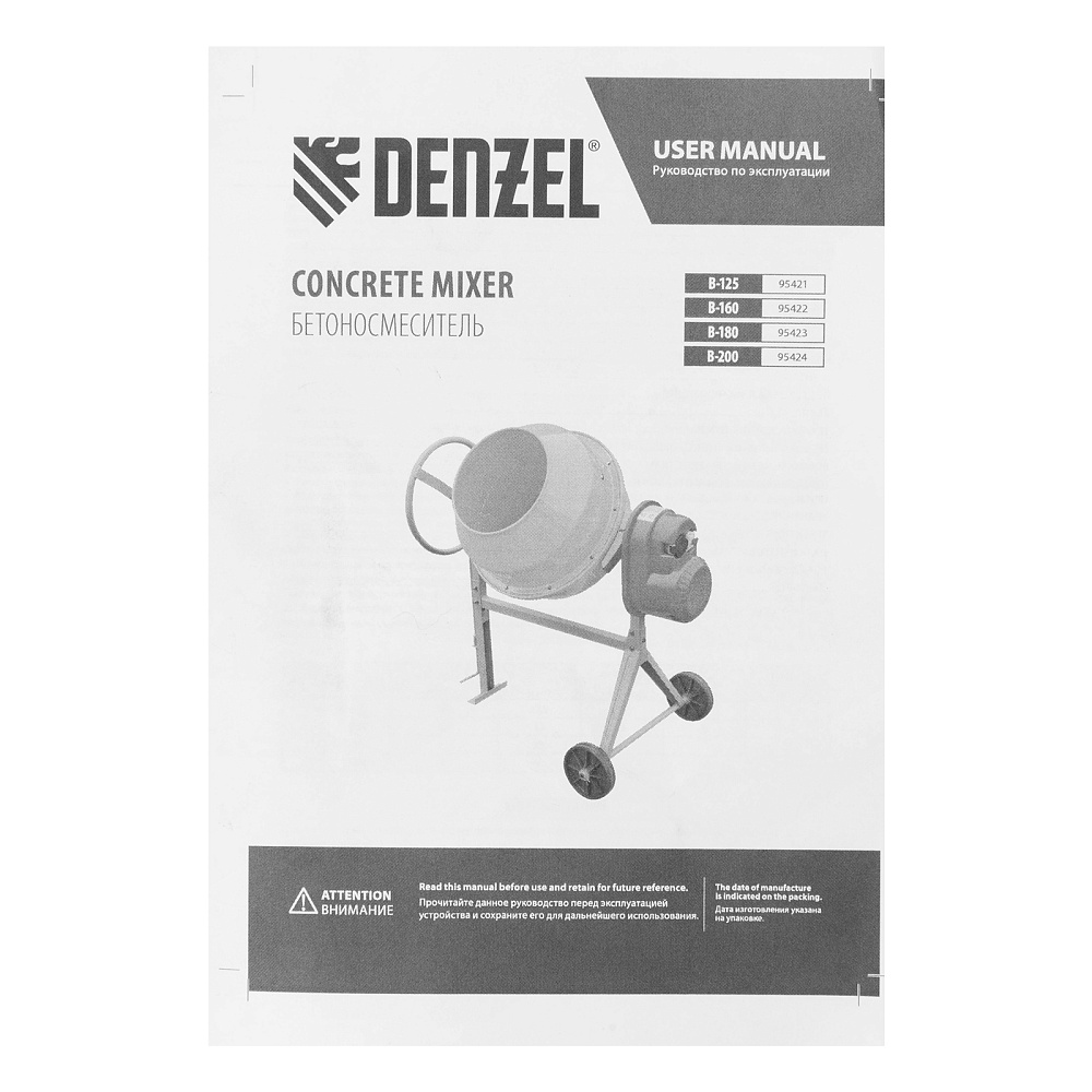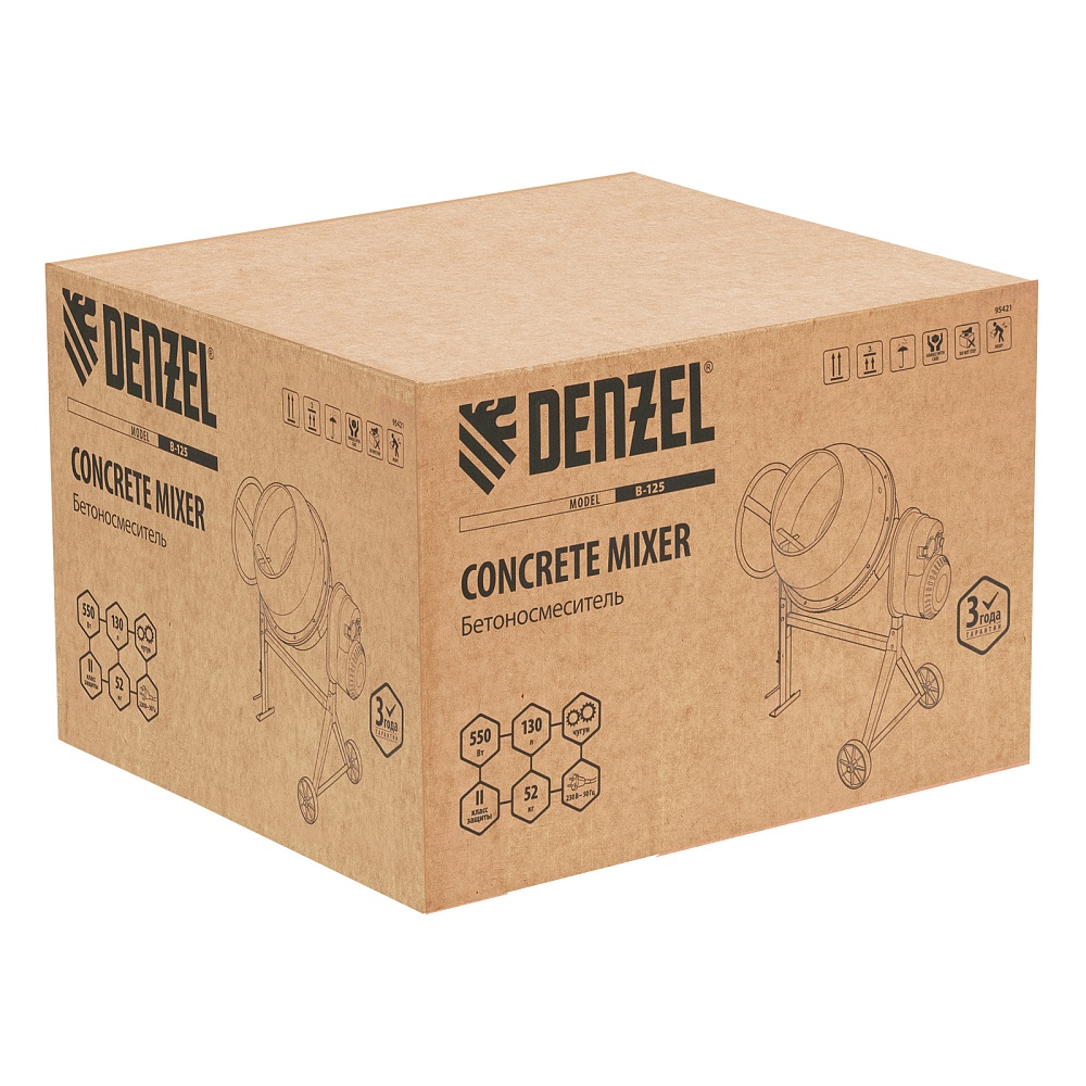 <p>Бетоносмеситель Denzel B-125 95421 используется для приготовления раствора цемента, бетона или других смесей. Усиленная конструкция, оптимальное соотношение мощности двигателя 550 Вт и объема бака 130 л позволяют использовать устройство в режиме высокой нагрузки. Бетоносмеситель пригодится при проведении ремонтных работ и частном строительстве. Барабан объемом 130 л обеспечивает получение до 50 л готовой смеси (±10 %).</p><h2>Преимущества</h2><ul><li>Защита от перегрева — если неопытный пользователь перегрузит барабан, датчик термозащиты незамедлительно отключит питание, это позволит предотвратить повреждение обмотки двигателя.</li><li>Долговечность — барабан выполнен из стальных листов увеличенной толщины (верх 1,5 мм / низ 2 мм) и покрыт порошковой краской для защиты от коррозии.</li><li>Высокая металлоемкость конструкции — за счет применения усиленных узлов и элементов бетоносмеситель выдерживает повышенные нагрузки.</li><li>Безопасная эксплуатация — ведущая шестерня закрыта широким защитным кожухом, предотвращающим затягивание посторонних предметов в привод.</li><li>Прочность — шестерня и венец сделаны из чугуна, в конструкции венца нет ослабляющих сквозных отверстий, т.к. он крепится к барабану через проушины, вынесенные за его тело.</li><li>Надежность и высокий ресурс — втулка, передающая вращение от вала непосредственно ведомому шкиву, произведена из прочной стали.</li><li>Фиксация угла наклона барабана — в конструкции бетоносмесителя предусмотрена педаль, позволяющая фиксировать бак в нужном положении и дозировать выгрузку готовой смеси.</li><li>Возможность экстренного выключения — при возникновении внештатной ситуации достаточно просто «стукнуть» по большой наружной кнопке, и работа двигателя моментально прекратится.</li><li>II класс защиты от поражения электрическим током — устройство имеет двойную изоляцию токопроводящих элементов, что подтверждено сертификатом.</li><li>Сниженный уровень шума 86 дБ — толщина венца увеличена, поэтому бетоносмеситель работает тише по сравнению с классическими моделями, также уменьшается уровень вибраций.</li><li>Защита от коррозии — бак окрашен стойкой порошковой краской, она не стирается со временем и долго сохраняет первозданный вид.</li><li>Простое обслуживание — узел крепления оси барабана легко разбирается, это значительно упрощает замену подшипников.</li><li>Удобная транспортировка — колеса упрощают перемещение бетоносмесителя по строительной площадке.</li><li>Степень защиты внутренних узлов IP44 — двигатель закрыт корпусом, кнопки управления — пластиковой крышкой, не допускающей попадания строительной пыли и влаги.</li><li>Гарантия 3 года — высокое качество бетоносмесителя подтверждено производителем.</li></ul>