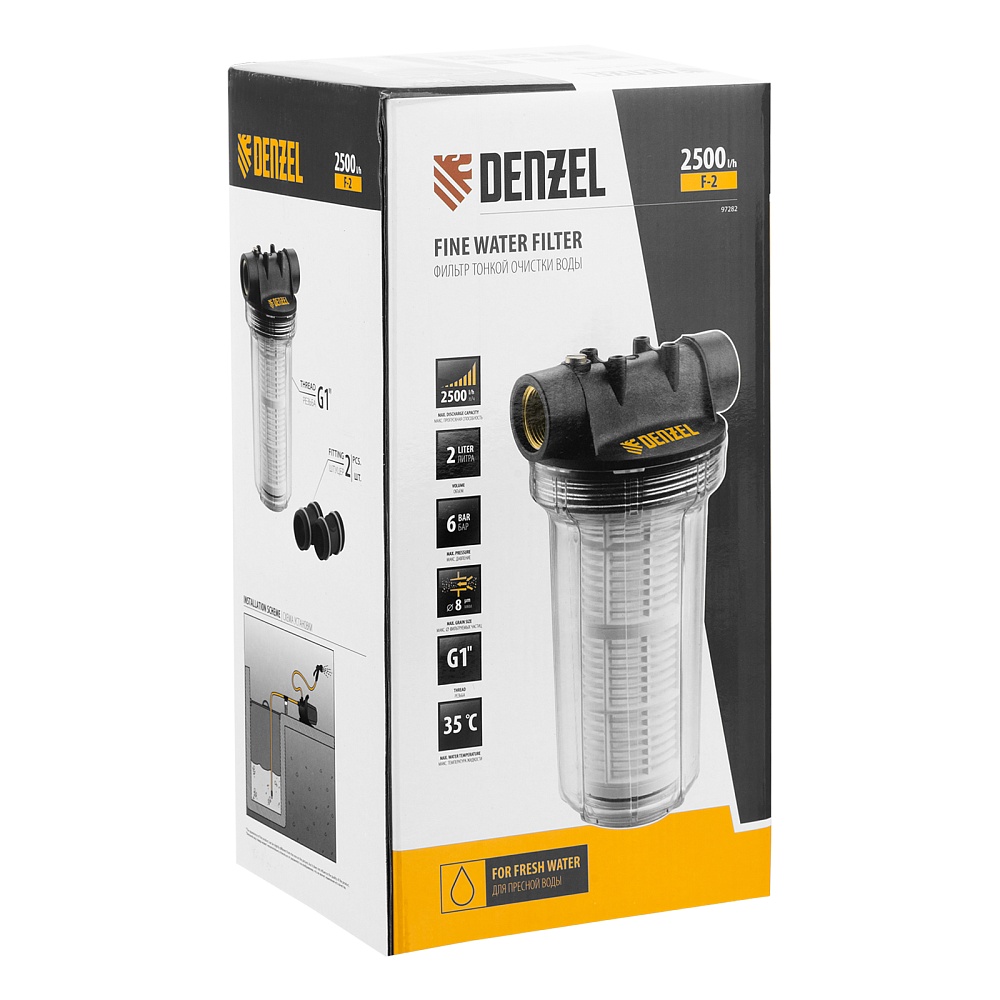 <p>Фильтр Denzel F2 97282 объемом 2 л, с присоединительным диаметром 1 дюйм, используется для очищения воды от песка и грязевых частиц диаметром до 8 мкм. Применяется на насосах и насосных станциях ТМ Denzel, будет полезен для организации системы водоснабжения на загородном участке.</p><h2>Преимущества</h2><ul><li>Надежность и долговечность — корпус выполнен из ударопрочного пластика.</li><li>Прозрачный корпус — можно оценить степень загрязнения фильтра, не разбирая его.</li><li>Простое обслуживание — фильтр легко разбирается, поэтому его удобно чистить.</li></ul>
