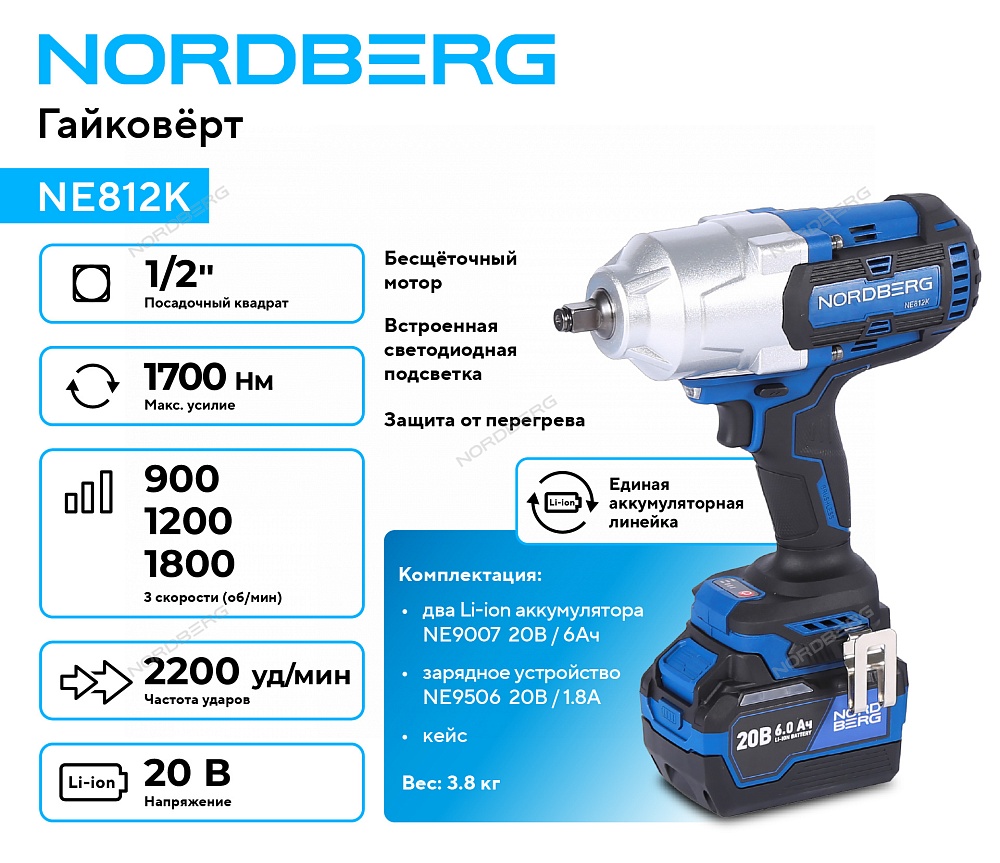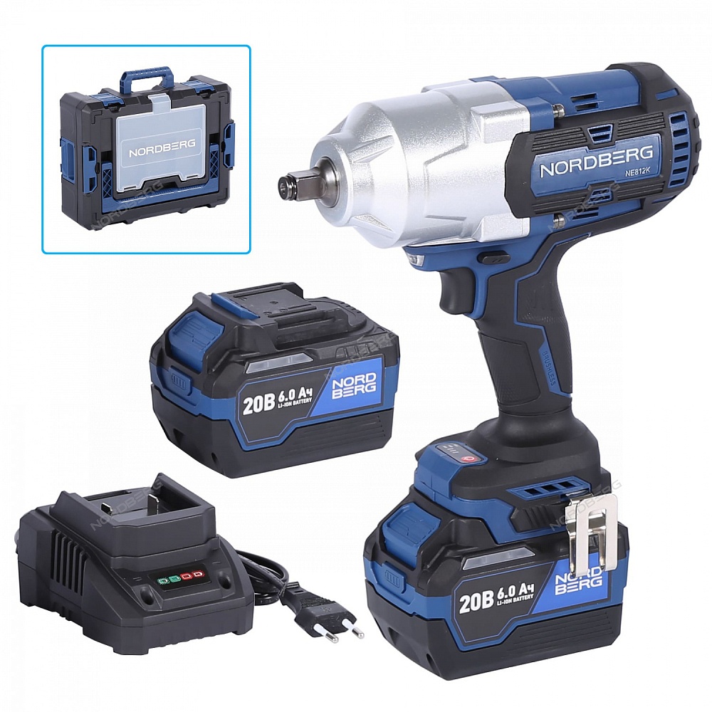 Гайковерт аккумуляторный, 1/2", 21 В, 1700 Нм, 2 аккумулятора 6A и зарядное устройство, в кейсе NORDBERG NE812K купить в Красноярске цена ✅ - Все для СТО
