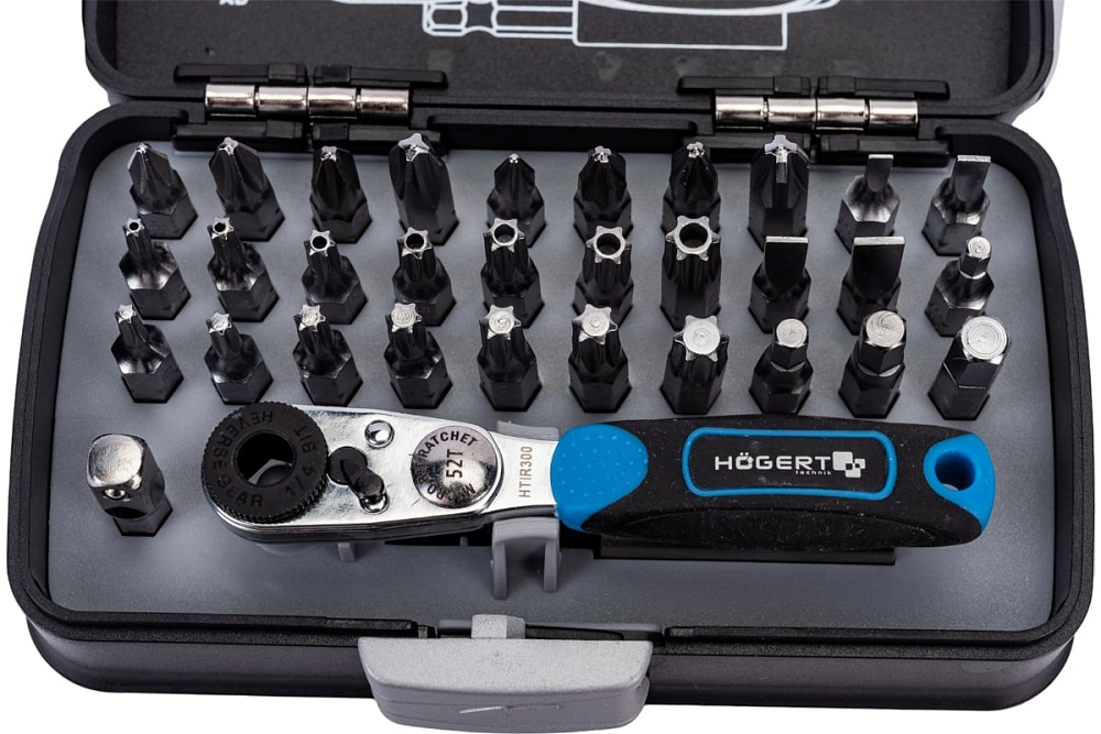 HOEGERT Набор бит с трещоткой 1/4", SL, PH, PZ, HEX, Torx, Torx c отверстием, 33 шт.