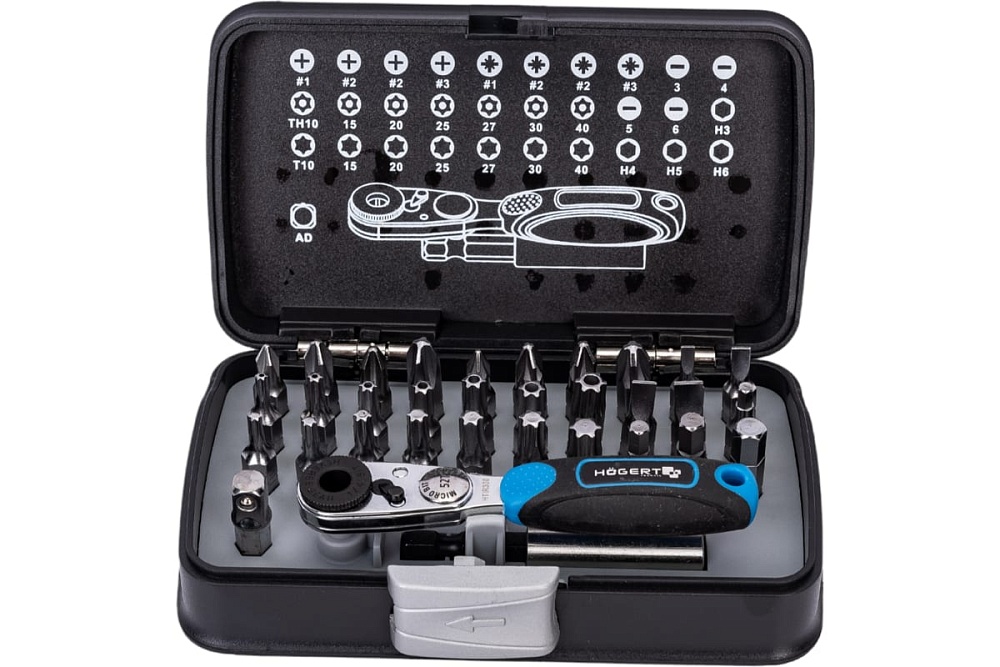 HOEGERT Набор бит с трещоткой 1/4", SL, PH, PZ, HEX, Torx, Torx c отверстием, 33 шт. купить в Красноярске цена ✅ - Все для СТО