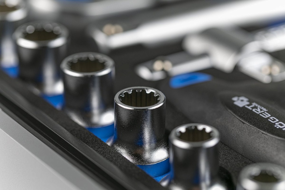 Набор торцевых головок, отверточных бит, аксессуаров 1/4” и 1/2”. Все торцевые головки были кованы по стандарту и имеют 12 клиньев. Это специальная форма позволяет подобрать головки к шестигранным, двенадцатигранным болтам и гайкам, torx, spline, квадратным и дюймовым размерам.