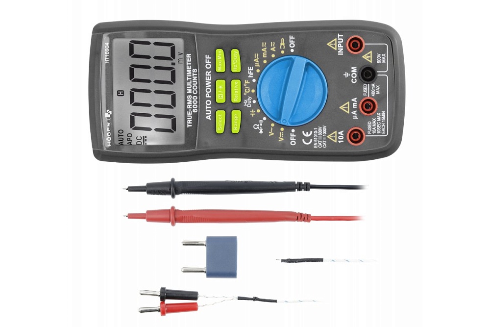 мультиметр может измерять напряжение постоянного и переменного тока до 600 В, постоянный и переменный ток до 10 А и сопротивление до 60 MΩ, емкость до 60 мФ, частота до 10 МГц, тестирование диодов и непрерывность работы;