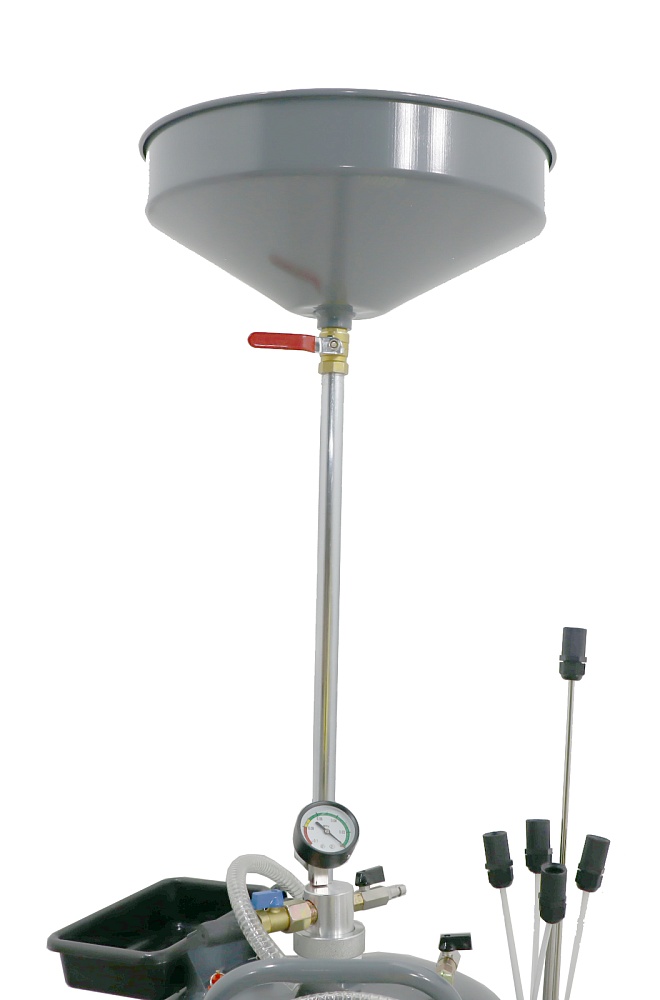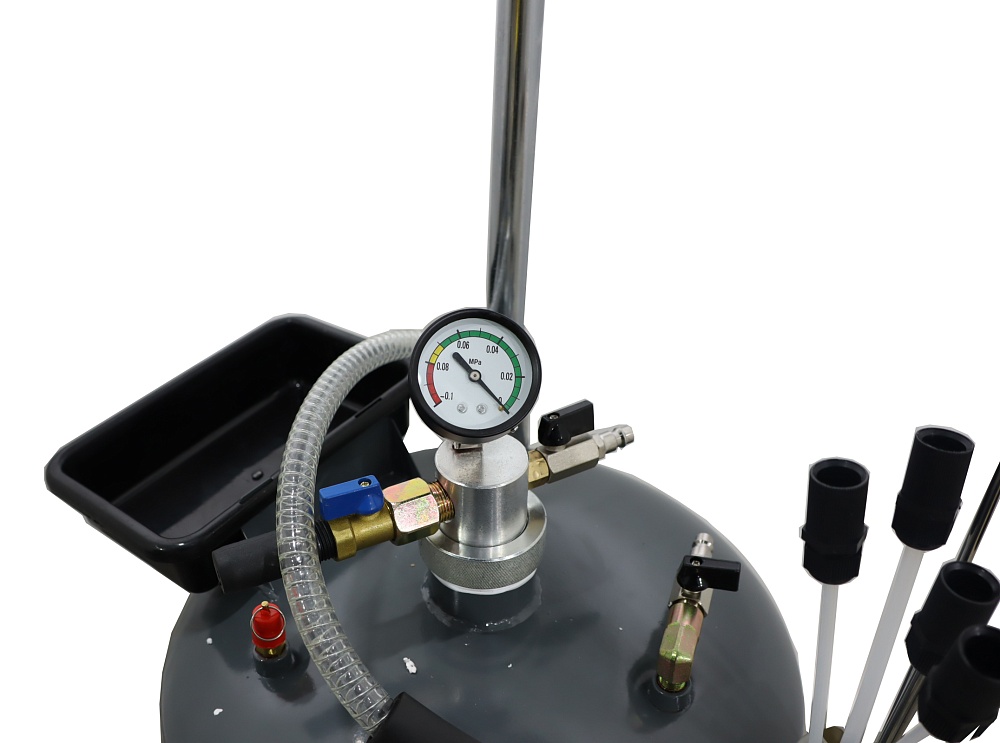 Установка KRAFTWELL, модель KRW1832.80L предназначена для сбора масла, антифриза и других технических жидкостей методом слива самотеком, а также откачкой через щупы. Высота приемной ванны регулируется позволяя точно подобрать удобное положение при работе, а также защитить от разбрызгивания масла.  У основания приемной ванны расположен шаровый кран, перекрывающий слив жидкости в основную емкость до контроля ее состояния. Процедура откачки технических жидкостей через щупы основана на принципе вакуумирования, при котором создается разряжение и жидкость засасывается в емкость, и используется в тех случаях, когда слив невозможен. В комплекте с установкой поставляется набор из 6 щупов различной длины и материала. Индикатор уровня, расположенный на емкости, показывает ее наполненность и вовремя сигнализирует о необходимости опустошения. Для слива жидкости из установки необходимо подключить сжатый воздух к штуцеру, расположенному в верхней части емкости. Под давлением вся жидкость выливается через гибкий шланг с жестким наконечником в емкость большего объема и затем утилизируется. Давление воздуха контролируется по манометру. Для безопасности на корпусе установлен клапан избыточного давления, который предохраняет стенки от деформации и разрушения.