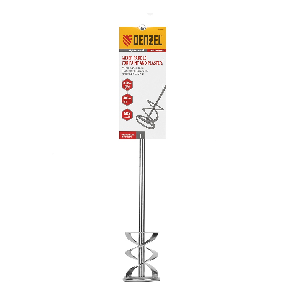 <p>Оцинкованный миксер для красок и штукатурных смесей Denzel 848817 размером 60 х 400 мм, с хвостовиком SDS Plus, используется для замешивания строительных растворов. Спиралевидная рабочая часть перемешивает состав снизу вверх, поэтому все компоненты распределяются в нем равномерно. Защитное кольцо предотвращает повреждение емкости для размешивания состава. Штукатурный миксер устанавливается в патрон перфоратора SDS Plus и применяется во время проведения строительных и отделочных работ.</p><h2>Преимущества</h2><ul><li>Прочность — сварная конструкция стального миксера устойчива к динамическим нагрузкам и выдерживает интенсивное применение.</li><li>Защита от коррозии и механических повреждений — насадка-миксер оцинкована.</li><li>Простая установка — хвостовик быстро и надежно фиксируется в патроне перфоратора.</li></ul>
