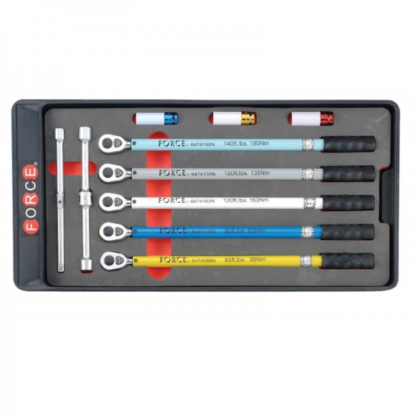 Ключ динамометрический 1/2" 88,108,135,163,190Nm с головками ударными глубокими (85мм) колесными 17,19,21мм, ключ балонный разобранный 17,19,13/16",1/2" (300мм) F-64707 "FORCE", в кейсе
