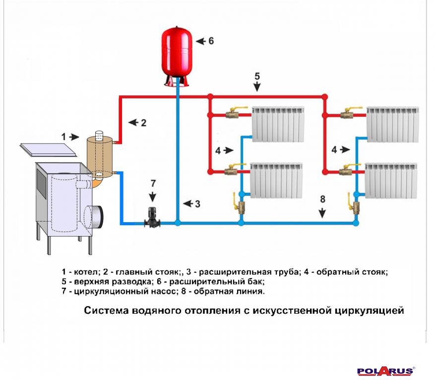 Отработанные горячие газы отводятся через трубу печи на отработке, которая проходит через резервуар, заполненный теплоносителем. К нагревателю подключают систему отопления, имеющую в составе (не входит в базовую комплектацию):