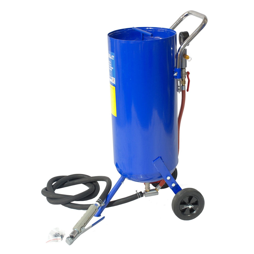 Аппарат пескоструйный T06510 AE&T напорного типа с резервуаром емкостью 38л оборудован керамическим соплом и запорным клапаном, манометром, 2.5м шлангом, воронкой, влагоотделителем, 6" резиновыми колесами