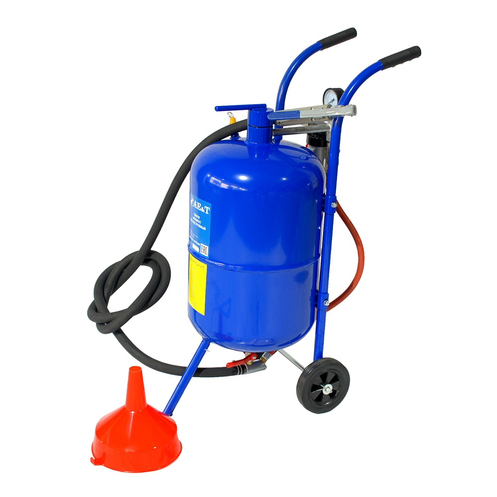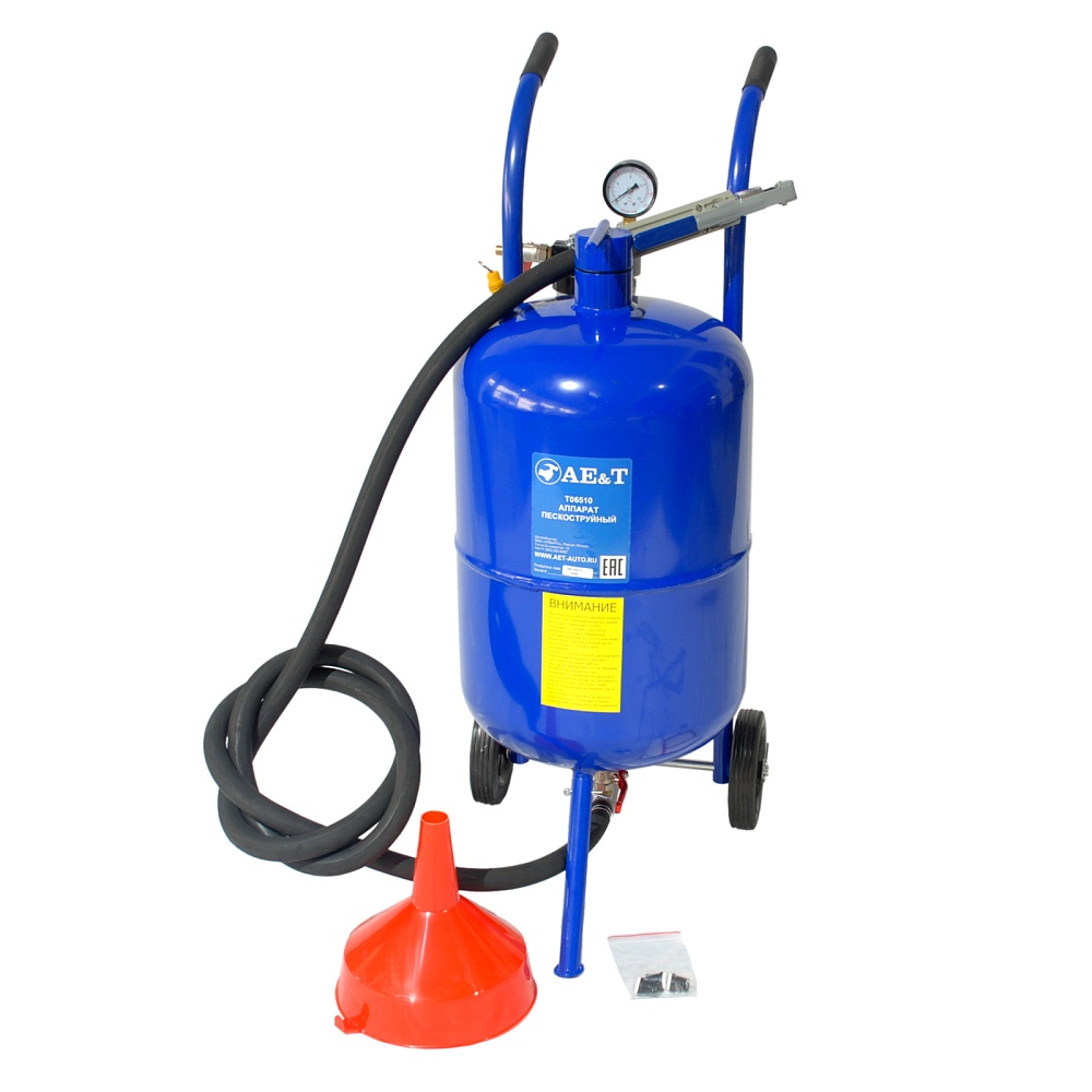 Аппарат пескоструйный T06510 AE&T напорного типа с резервуаром емкостью 38л оборудован керамическим соплом и запорным клапаном, манометром, 2.5м шлангом, воронкой, влагоотделителем, 6" резиновыми колесами