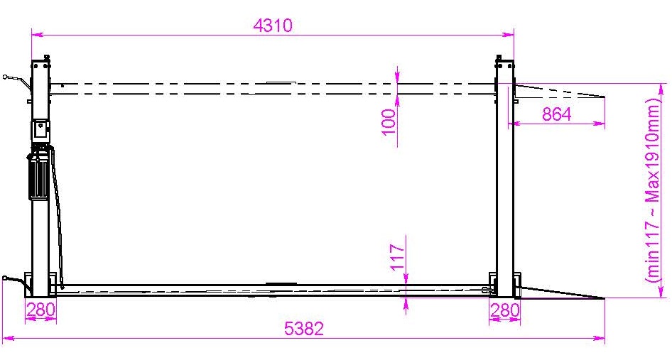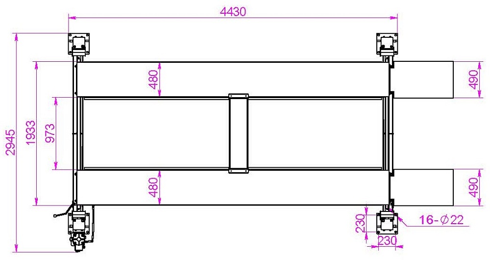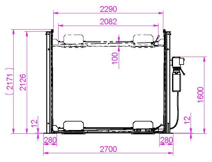 Подъемник четырехстоечный, электрогидравлический, г/п 4500 кг., 2,2 кВт, высота подъема 1830 мм., размеры платформ 5700х550 мм, платформы - комплектация для поста сх-развала.
