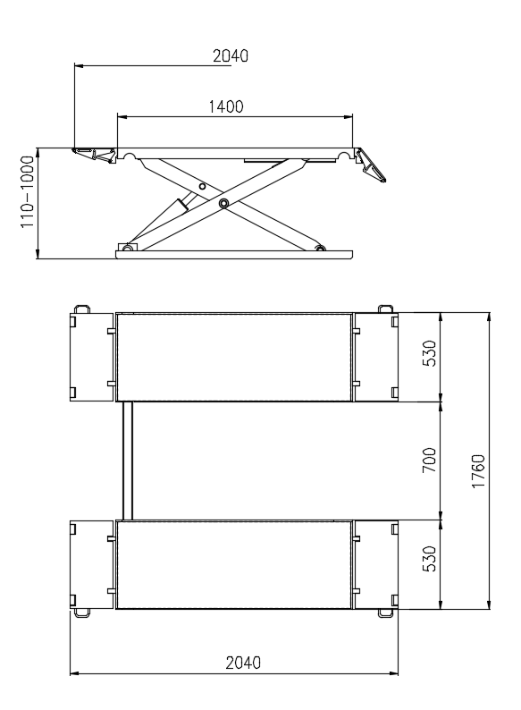 Подъемник ножничный, электрогидравлический, г/п 2700 кг., 2,2 кВт, высота подъема 1050 мм., размеры 1524х1000 мм., клиренс 100 мм., мобильный. Ручное управление стопором.