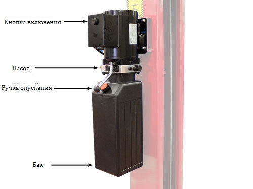 Электрогидравлический 2-х стоечный автомобильный подъёмник с верхней синхронизацией и разблокировкой рычагом на одной колонне, грузоподъемностью 4,5 тонны.