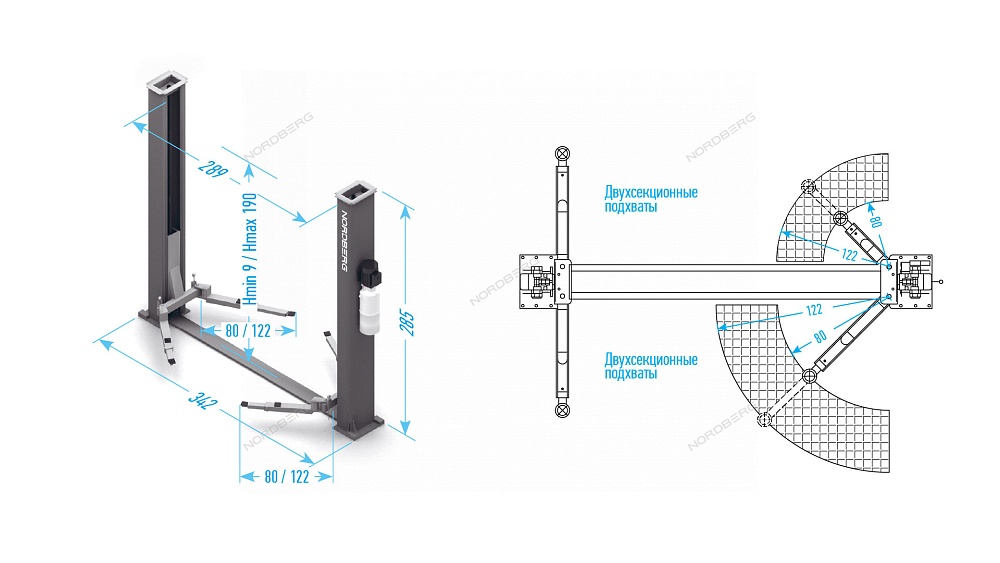 Подъемник 220V 2х стоечный 4т, со снятием стопоров с одной колонны (синий) NORDBERG N4120BM-4B