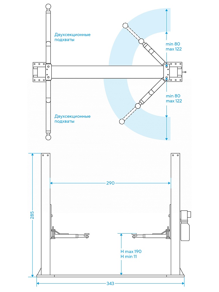 Двухстоечный электрогидравлический подъемник с верхней синхр, грузоподъемность 4.0 т, высота колонны 4231/4431мм, механическое управление стопорами на одной колонне.