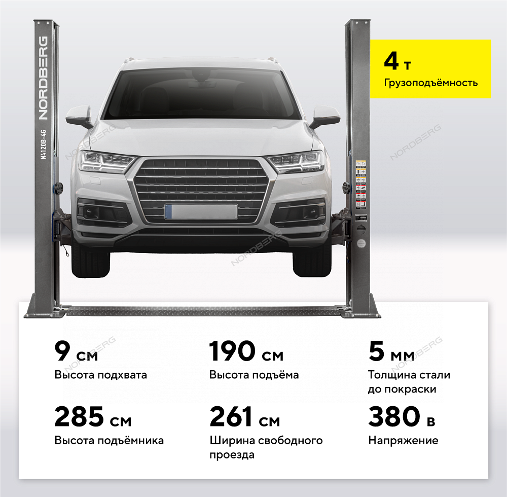 Двухстоечный подъемник NORDBERG N4120B-4G_3+2_220 – безопасное и надежное оборудование для проведения различных видов работ по обслуживанию и ремонту автотранспорта в автосервисах и СТО.