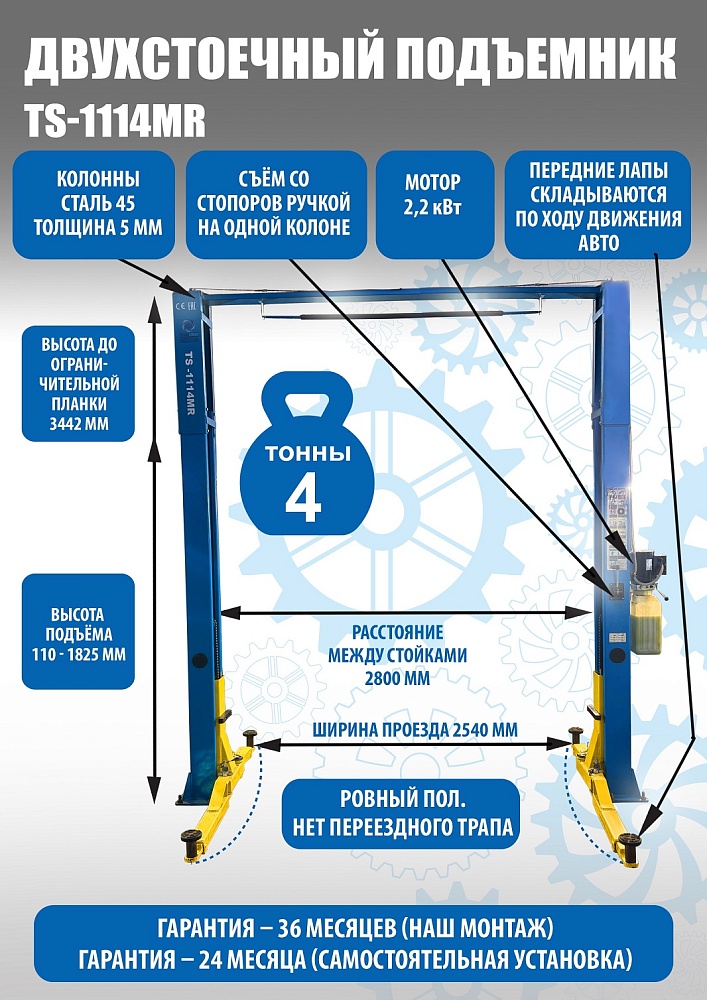 TS-1114MR подъемник 4 т, 2-х ст. электрогидравлический (2025) (380 V ТВ) купить в Красноярске цена ✅ - Все для СТО