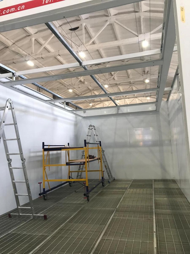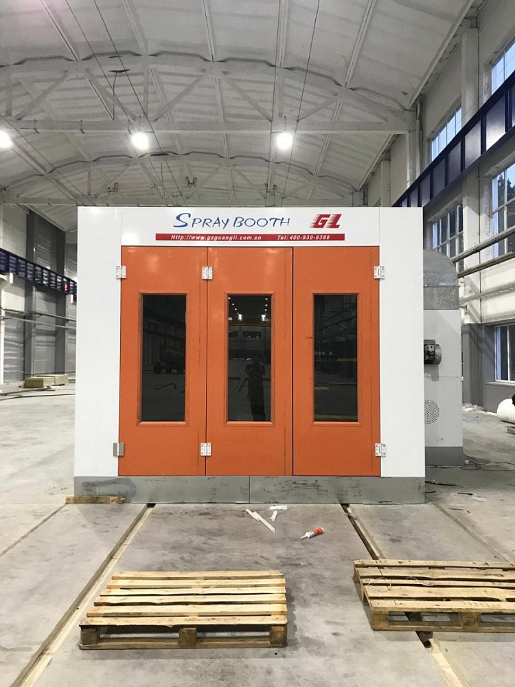 Окрасочно-сушильная камера Guangli GL2 имеет в своей основе металлическое основание высотой 25 см, напольные решётки выдерживает нагрузку до 600 кг на одно колесо. В стандартном исполнении камера Guangli GL2 комплектуется дизельной горелкой из нержавеющей стали Riello 40 G20 итальянского производства, мощность горелки составляет 185 кВт. Корпус Guangli GL2 собирается из сэндвич-панелей толщиной 50 мм, в качестве наполнителя используется пенополистирол, опционально можно в качестве наполнителя использовать минеральную вату. Фронтальная дверь окрасочно-сушильной камеры состоит из 3-х створок, аварийная дверь находится сбоку камеры, она оборудована пневматическим затвором. Окрасочно-сушильная камера Guangli GL2 оборудована двумя вентиляторами: приточным и вытяжным (особенность комплектации). Наличие двух вентиляторов позволяет увеличить воздухообмен внутри камеры до 24 000 м³/час. Приточный вентилятор обладает мощностью 5.5 кВт, мощность вытяжного вентилятора составляет 4 кВт. Заслонка, переключающая режимы окраска/сушка, срабатывает автоматически посредством пневматики. Система фильтров состоит из: потолочного фильтра (степень фильтрации 98%), напольного фильтра (степень фильтрации 95%) и фильтра предварительной очистки (степень фильтрации 80%). Потолочный фильтр окрасочно-сушильной камеры состоит из 4-х фильтров, которые монтируются над несущей рамой, выполненной из стали и покрашенной порошковым покрытием. Напольный фильтр состоит из 2-х частей и одного выпускного фильтра. Верхнее освещение состоит из 10 плафонов, каждый плафон состоит из 4 ламп по 40 Вт. Блок управления и его компоненты произведены в Китае, они защищены от перегрузки, перегрева и пропадания фазы, мотор с линейным приводом. При истечении заданных значений времени, работа камеры автоматически прекращается. Покраска происходит при постоянной температуре. Питание камеры осуществляется посредством трёхфазной сети напряжением 380 В, мощность установки 9.5 кВт.