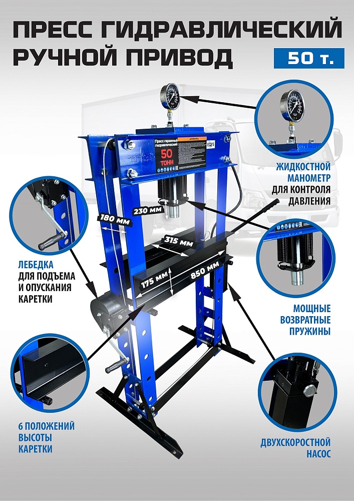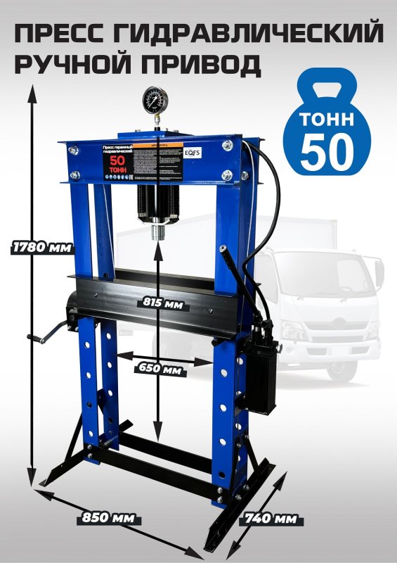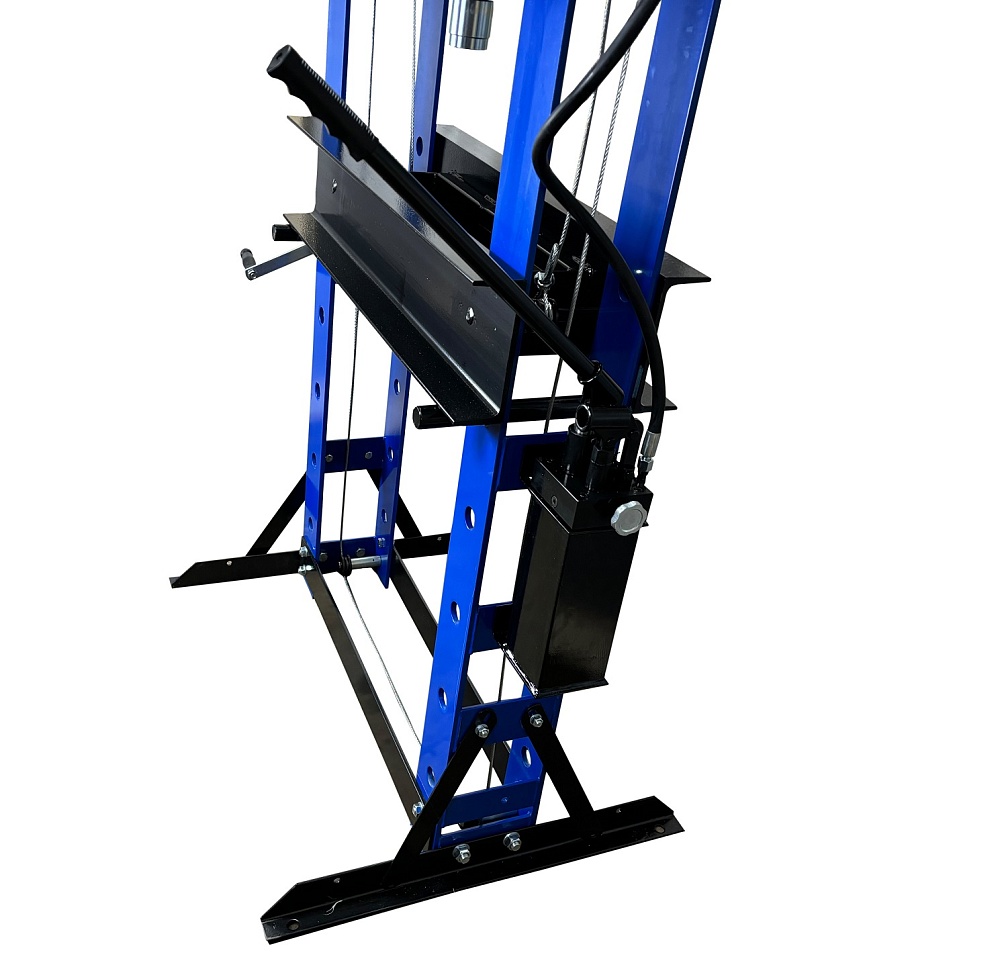 Пресс гидравлический, ручной усилие 50т. Две скорости подачи пуансона. Первая скорость для быстрой подачи штока к рабочей поверхности, вторая (медленно) для выпрессовки. Применяется для запрессовки подшипников, деталей машин и механизмов в гаражах, автосервисах и СТО. Цвет синий.