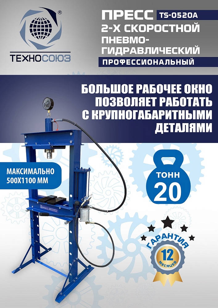 Пресс TS-0520A с усилием 20 тонн сочетает пневмогидравлический и ручной привод для универсальной работы в гаражах и СТО. Пневмопривод ускоряет выпрессовку неответственных деталей вроде втулок при потоке задач, а ручной насос обеспечивает точное дозирование усилия для подшипников.