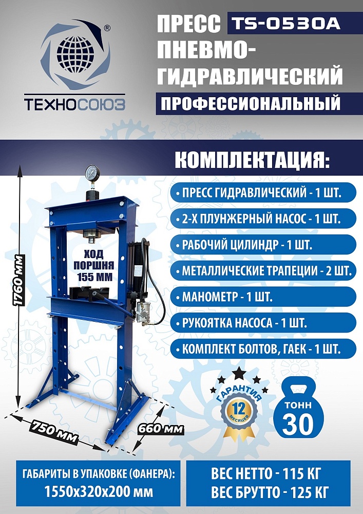 Пневмогидравлический пресс 30 тонн TS-0530A: мощь и универсальность для СТО
