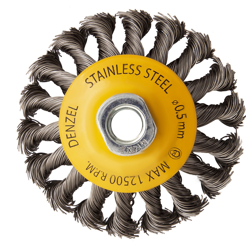 <p>Щетка для УШМ Denzel «Тарелка» 746093, 100 мм, М14, с щетиной из крученой нержавеющей проволоки 0,5 мм, предназначена для снятия толстого слоя краски, лака, ржавчины, для удаления заусенцев и окалины, зачистки сварных швов. Щеткой обрабатывают твердые, преимущественно металлические поверхности, в том числе из нержавеющей стали. Она удобна для очистки как плоских изделий, так и внутренних углов, пазов, изгибов. Щетка совместима с углошлифовальными машинами, поддерживающими работу на скорости до 12500 об/мин. Во время работы необходимо использовать средства индивидуальной защиты. Щетка пригодится во время строительства, на производстве, а также будет полезна в быту.</p><h2>Преимущества</h2><ul><li>Щетина изготовлена из нержавеющей стали AISI 201, поэтому ее частицы не вызывают микрокоррозии обрабатываемой поверхности.</li><li>Проволока имеет витую форму, что обеспечивает высокую деформационную стойкость щетины.</li><li>Щетина из нержавейки и покрытый эмалью корпус не подвержены коррозии, поэтому насадку можно использовать в условиях повышенной влажности.</li><li>Для крепления на вал УШМ предусмотрена гайка М14, что позволяет быстро устанавливать и заменять оснастку.</li><li>Корпус и гайка усилены, поэтому щетка устойчива к повышенным нагрузкам.</li><li>Щетка изготовлена под строгим технологическим контролем, что гарантирует ее высокое качество.</li></ul>