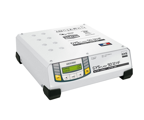 Gysflash 50,12 HF - это умное инверторное зарядное устройство, позволяет заряжать, подпитывать и обеспечивать правильную эксплуатацию акб машин в выставочных залах. Имеет максимальный зарядный ток 50 А и работает с 12В акб емкостью от 10 до 600 Ач.