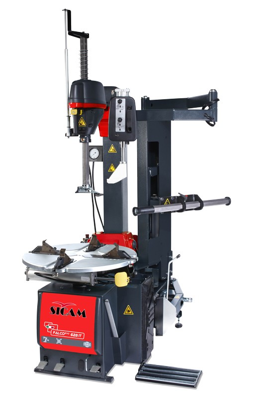 FALCO EVO628IT V1 - автоматический шиномонтажный станок (монтажная стойка откидывается назад) для сборки и разборки колес легковых автомобилей и легких грузовиков размером до 32 дюймов. Станок позволяет обслуживать колеса из легких сплавов размером до 32 дюймов без дополнительных приспособлений. Имеет мощное отжимное устройство борта покрышки. Усиленная жёсткость конструкции  (G-образная рама). Управление положением монтажной стойки производится педалью и кнопкой пневматической блокировки положения лапы. Стол с самоцентрирующимся зажимным устройством диска. Конструкция станка проста и надежна, имеет большой запас прочности, пригодна для тяжелых условий эксплуатации.